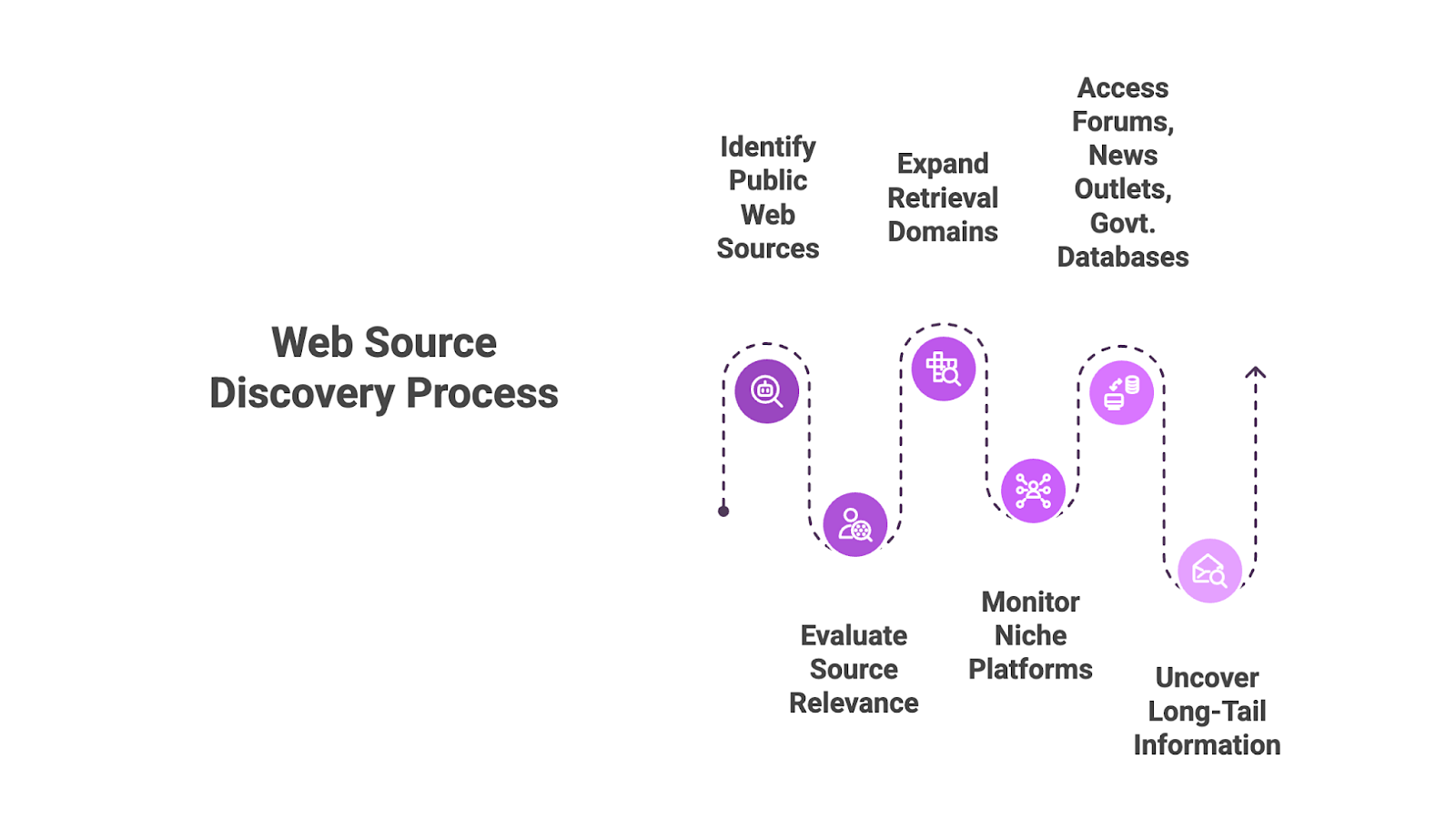 - A retrieval layer identifies relevant public web sources. It evaluates the digital landscape to determine which specialized domains, such as databases, news outlets, or e-commerce platforms, are most likely to house the necessary data.