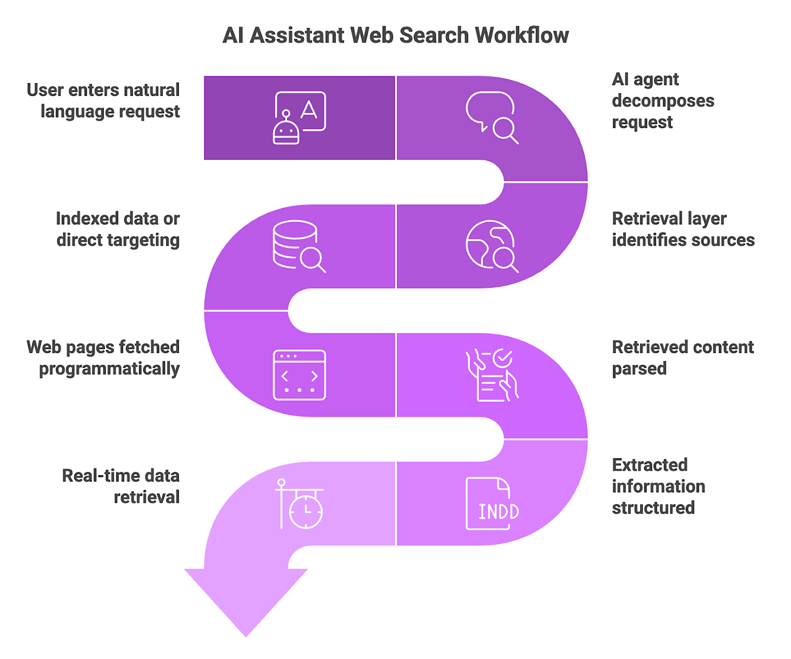 AI assistants must follow a structured, programmatic workflow to interact with the live web. This process transitions the assistant from a simple text generator into an active agent capable of discovering and validating information in real-time.