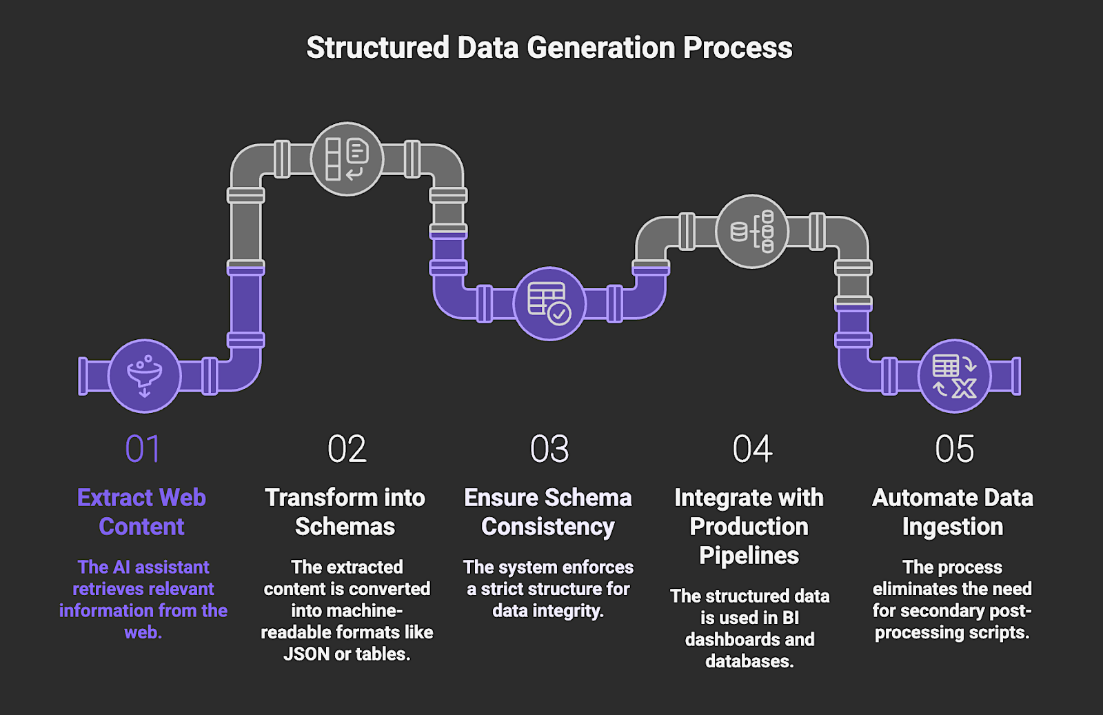 Engineers implement this capability where data needs to be ingested by BI dashboards or databases, such as for large-scale competitive intelligence, CRM automations, and real-time price monitoring. Implementation involves defining specific output schemas within the agent's function-calling definitions or using structured output APIs to map web elements directly to predefined keys. This approach eliminates the need for secondary post-processing scripts and ensures that the assistant's output is instantly consumable by downstream enterprise infrastructure.
