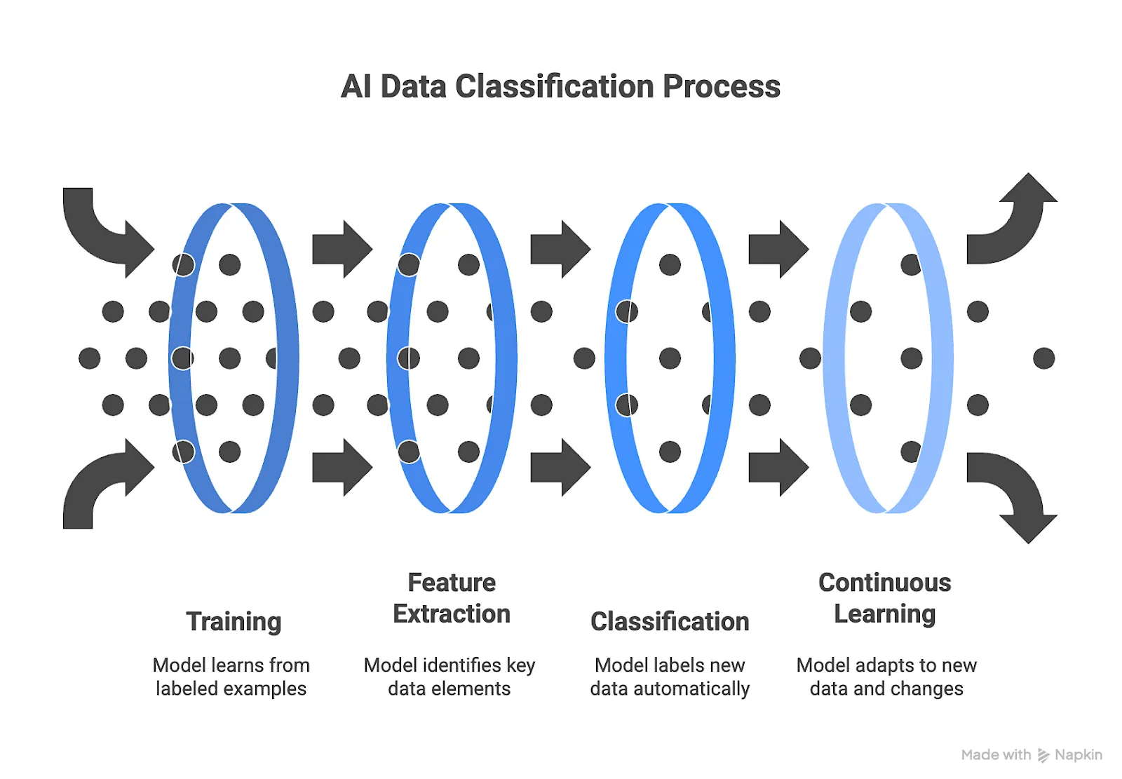 While implementation details vary, most AI data classification systems follow four main stages that build on one another to create accuracy and scale: