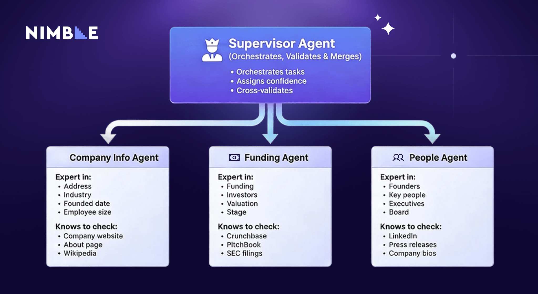 For deeper data needs, Nimble's site-specialized data extraction kicks in. A Crunchbase-trained agent understands exactly where funding data lives. A LinkedIn agent knows company page structure. This site-awareness delivers enterprise-grade accuracy that generic crawlers can't match.