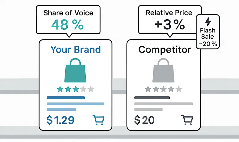 - Launch monitoring on a flagship category, a top-100 SKU list, or a single geography.