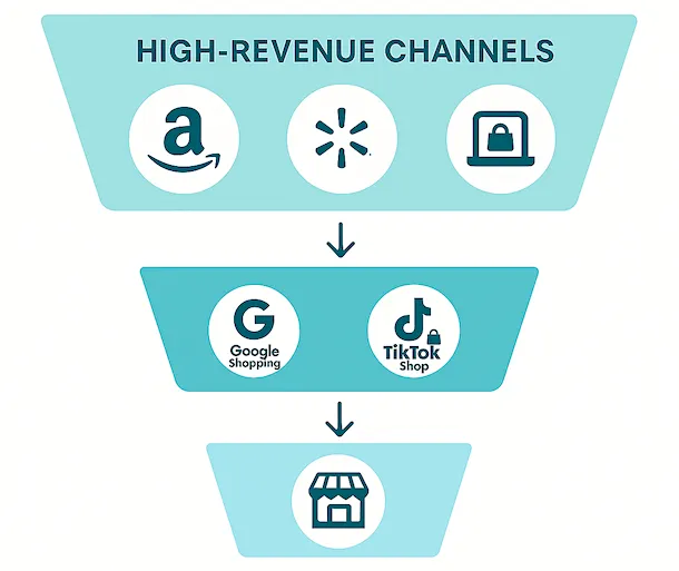 - Then add others, like Google Shopping, TikTok Shop (and other social stores), and local marketplaces.