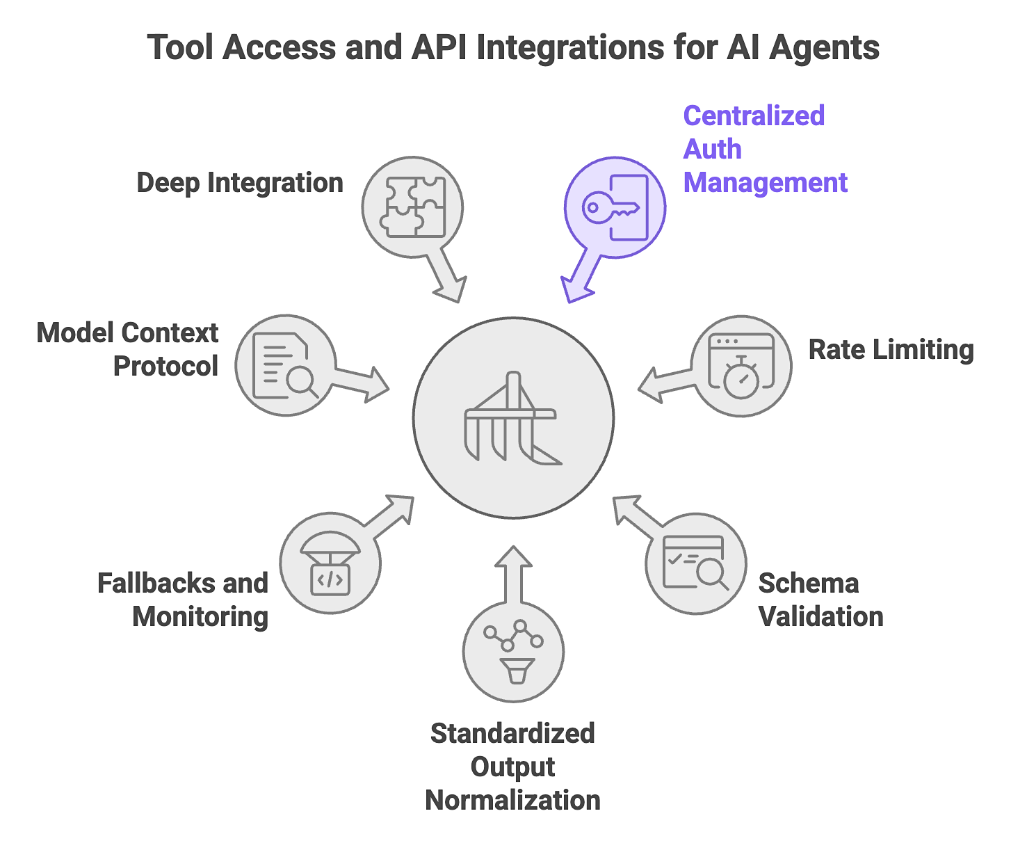 - Centralized auth management, rate limiting, and schema validation for all integrated tools.