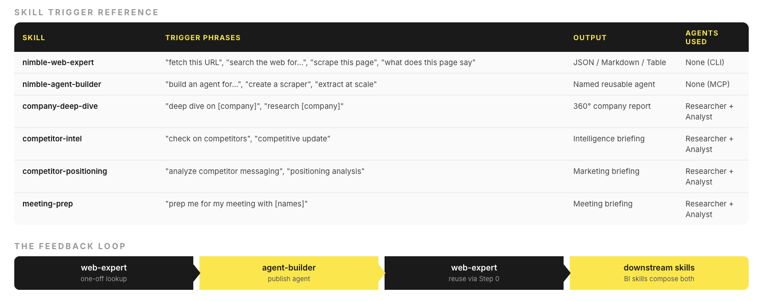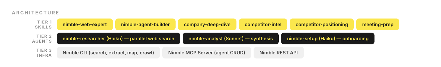Agents are the execution layer. A skill like competitor-intel doesn't make web calls itself — it orchestrates nimble-researcher agents to gather data in parallel, then routes results to nimble-analyst for synthesis. This separation lets us optimize each agent for its role: