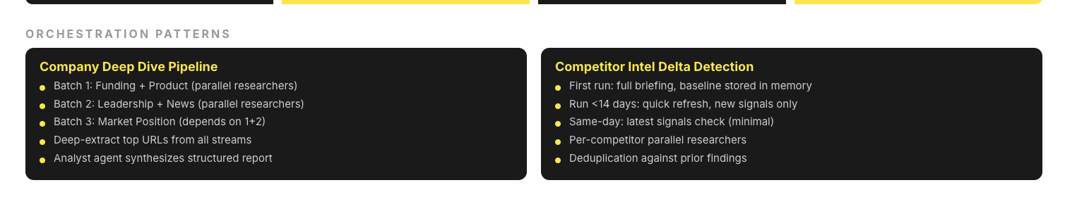 competitor-intel has a notable feature: delta detection. On first run, it establishes a baseline of findings for each competitor. On subsequent runs, it compares new findings against the baseline and surfaces only what's changed.