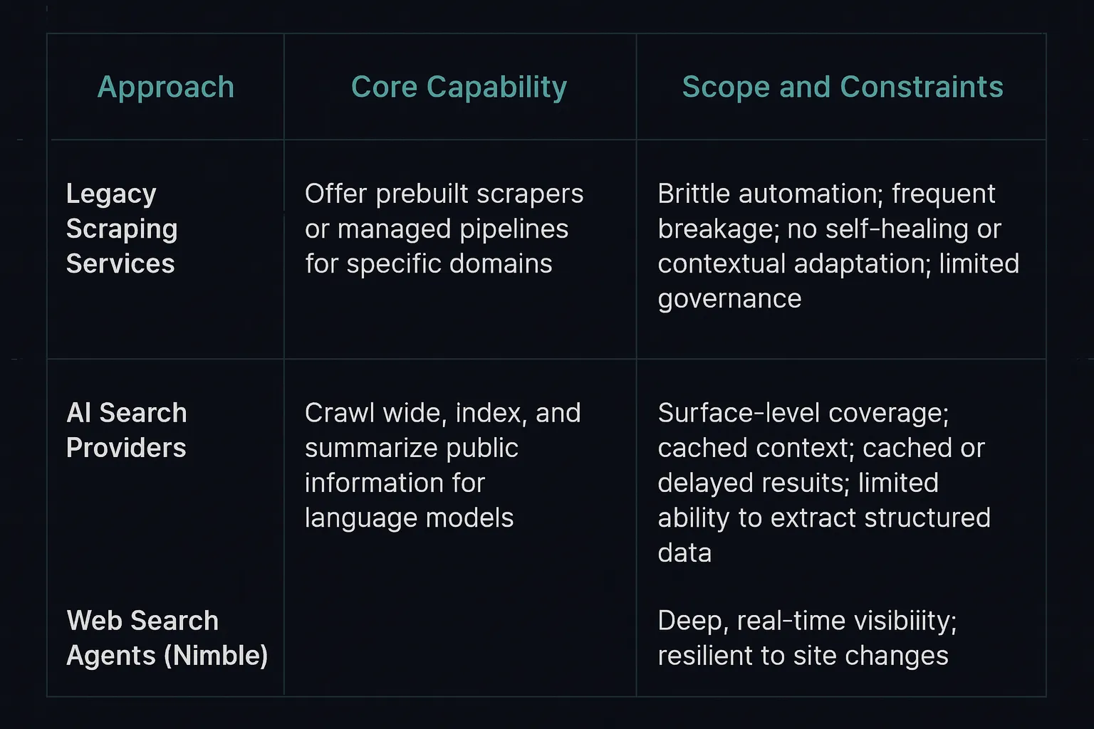 The difference between Web Search Agents and other web intelligence tools is not incremental; it’s architectural.