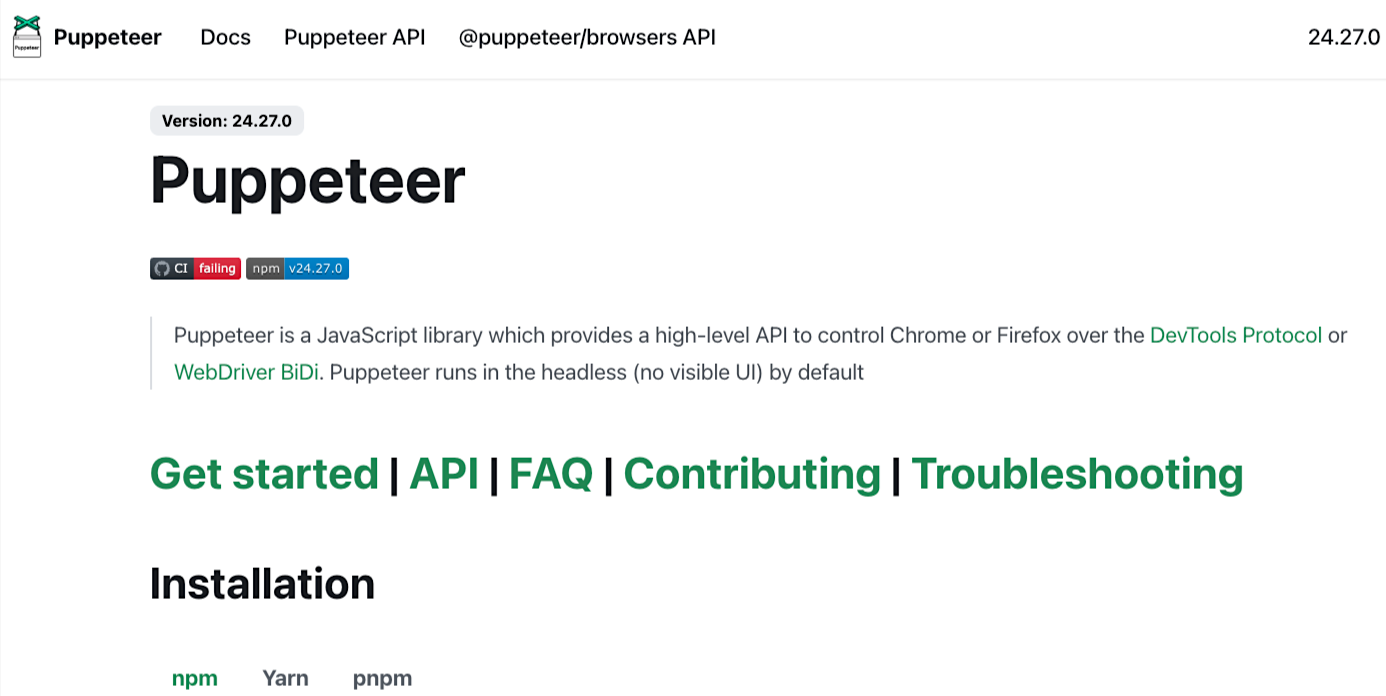 Review: “(Puppeteer’s) documentation is extensive, with clear examples and a well-organized API reference.”