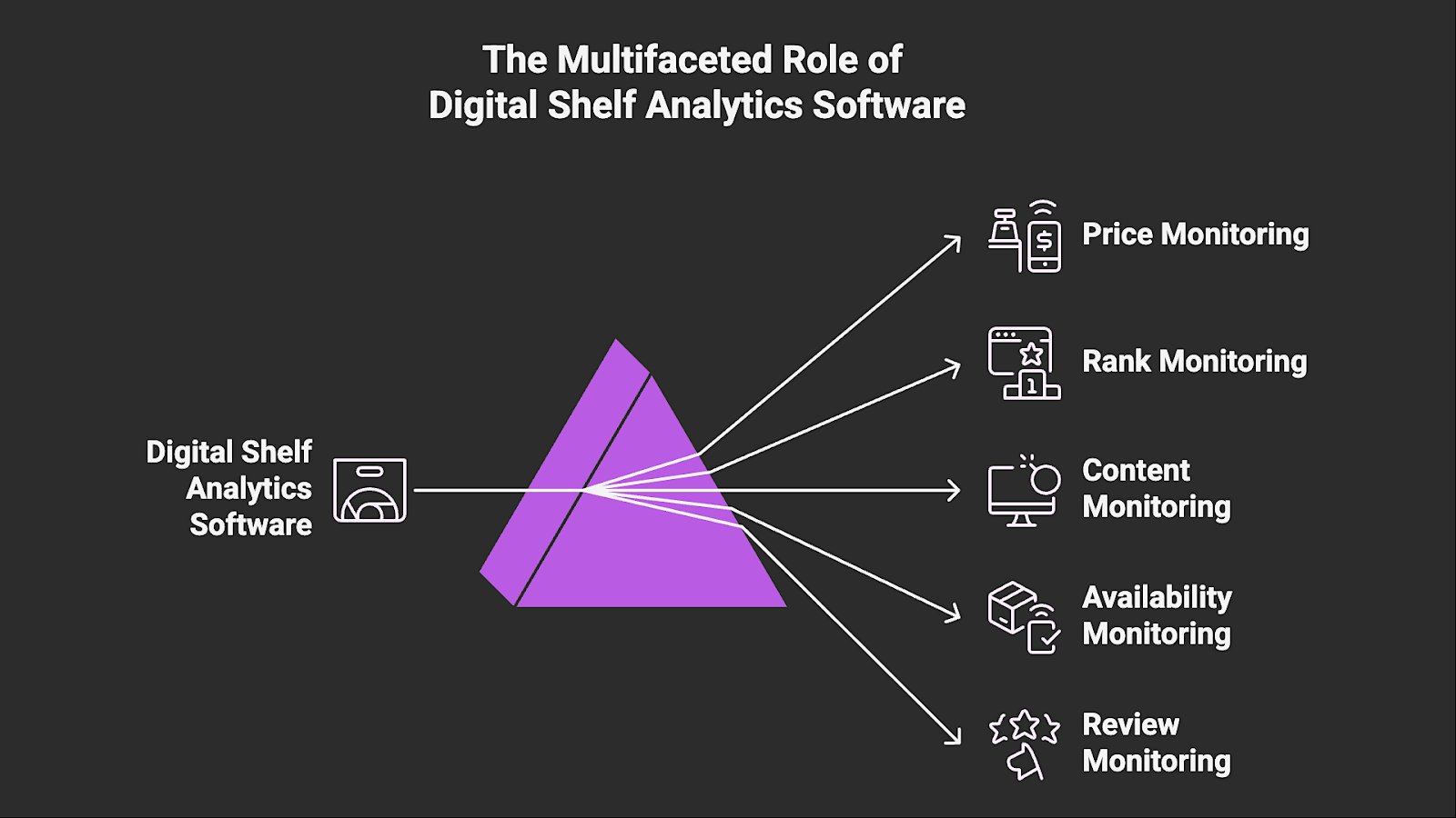 Digital shelf analytics (DSA) software is a specialized e-commerce tool that systematically monitors product listings and shelf signals across retailer and marketplace sites, such as price, rank, content, availability, and reviews. It monitors anyplace that your product is discoverable online to ensure consistent pricing, content, and availability. These locations include marketplaces like Amazon, Walmart, and eBay; DTC sites; and specialty and niche retailers.