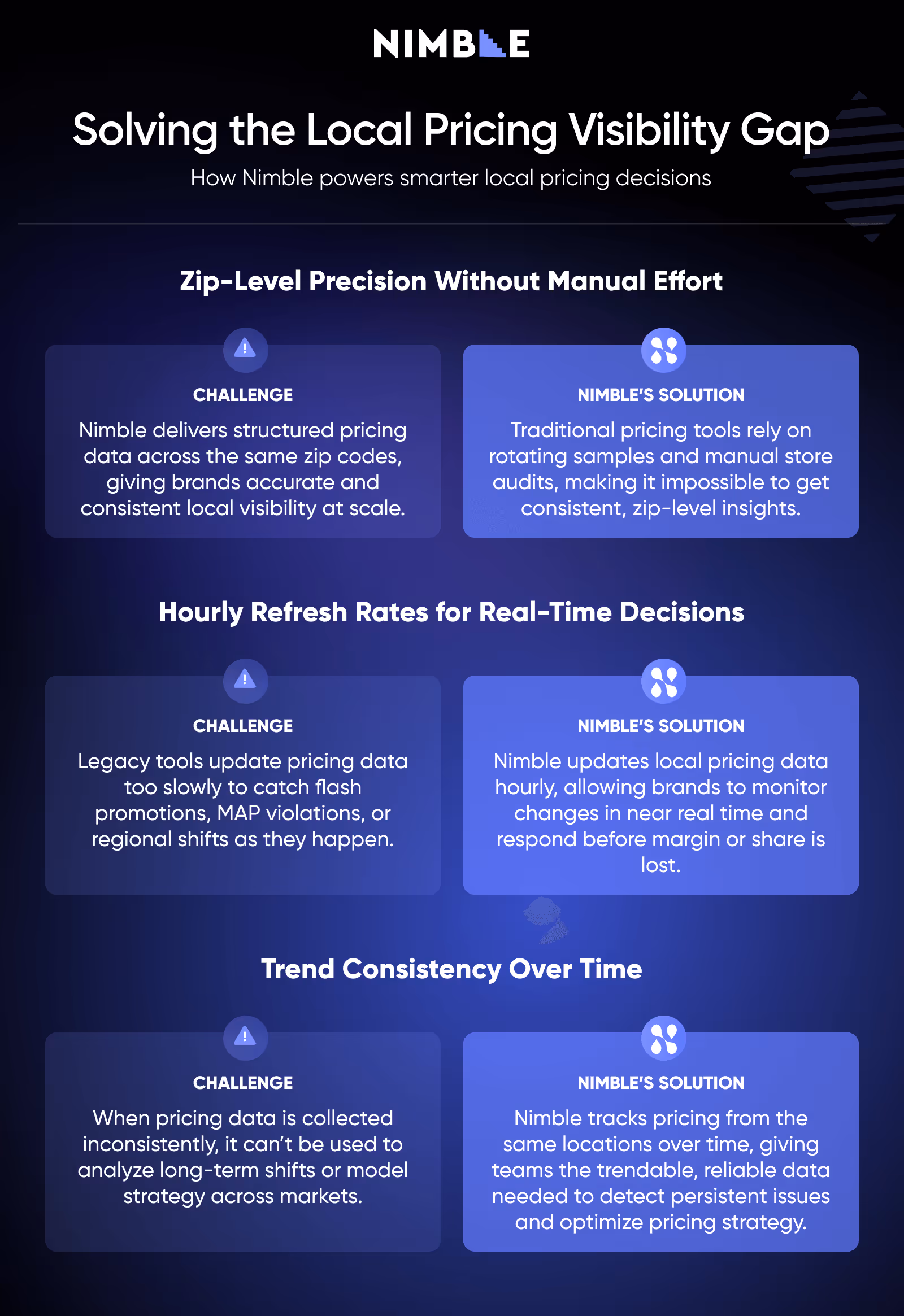 - Nimble provides real-time, hyperlocal pricing visibility that powers smarter retail pricing strategies.